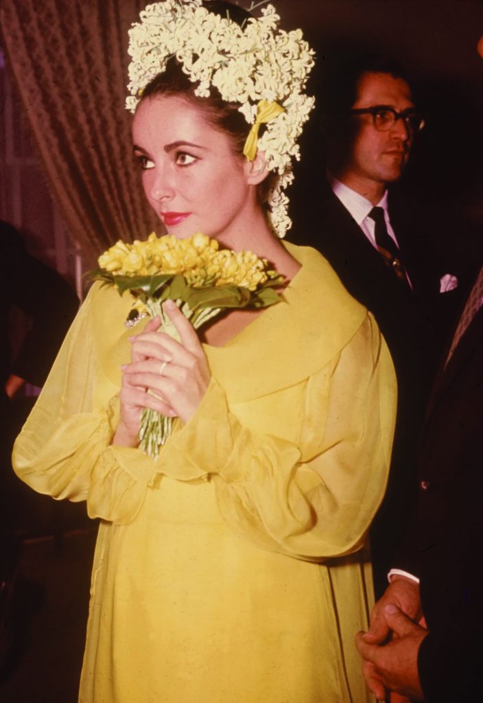 La prima a rompere gli schemi è Brigitte Bardot, che, nel 1959 aveva già lanciato il suo celebre abito a quadretti vichy, ma, nel pieno degli anni 60 conferma la sua immagine di donna libera e anticonformista. Nel 1964 Elizabeth Taylor, al suo matrimonio con Richard Burton, indossa un vestito giallo canarino in chiffon, con ghirlanda di fiori tra i capelli: una scelta audace e teatrale, abbandonando il bianco tradizionale per un colore solare e provocatorio.