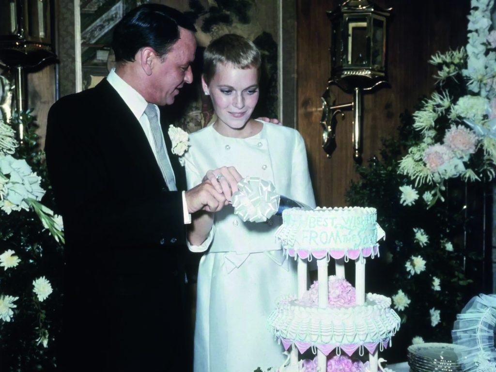 A metà del decennio esplode la “mod revolution”. Nel 1965 Jane Fonda si sposa con Roger Vadim in abito corto, con cappuccio bianco: semplice ma sensuale. Unisce purezza e modernità. Nello stesso periodo Marianne Faithfull, musa di Mick Jagger e icona londinese, sceglie un miniabito in pizzo bianco con stivali alti, incarnando la sposa ribelle della Swinging London. Il 1965 è anche l’anno del matrimonio tra Catherine Deneuve e il fotografo David Bailey. L’attrice francese ha un vestito corto, con fiocco in vita e velo a gabbietta: elegante, giovane e perfettamente in linea con la sobrietà sofisticata della moda parigina. Nel 1966 Mia Farrow si unisce in matrimonio con Frank Sinatra. Sfoggia un tailleur corto color crema, firmato Courrèges. Il suo look minimalista, unito al taglio dei capelli pixie , diventa il manifesto della “ bride mood “, moderna, androgina, emblema della nuova femminilità consapevole.